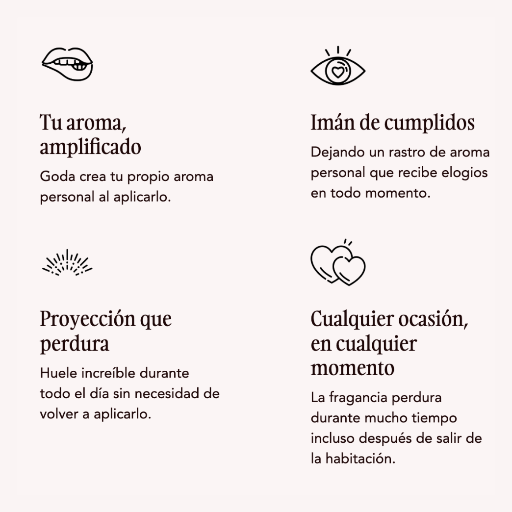No. Goda está creada para realzar, no para invadir. Se integra con la química de tu cuerpo y deja un aroma suave, sutil y natural, sin ser pesado ni empalagoso.